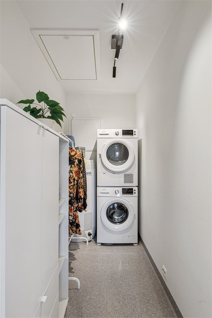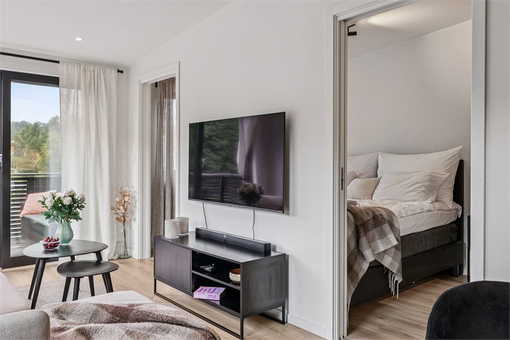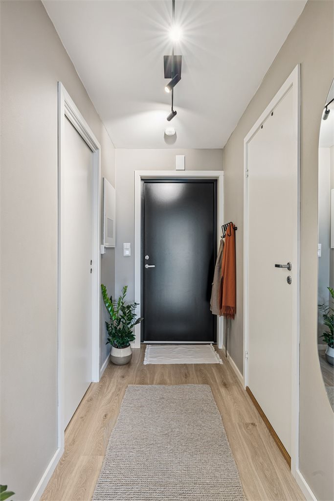 Leiligheten har en gjennomtenkt planløsning. Det er felles inngangsparti, enten fra parkeringskjeller eller ute via trapp.2. etasje: Gang, vaskerom, bad, stue og kjøkken, soverom og utgang til balkong.