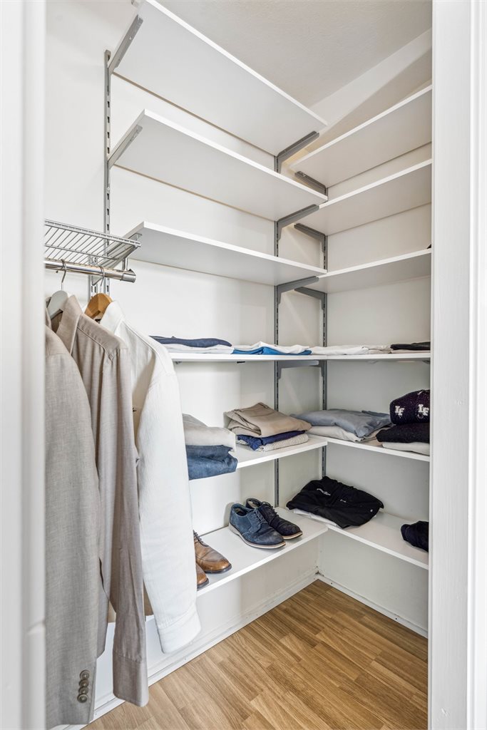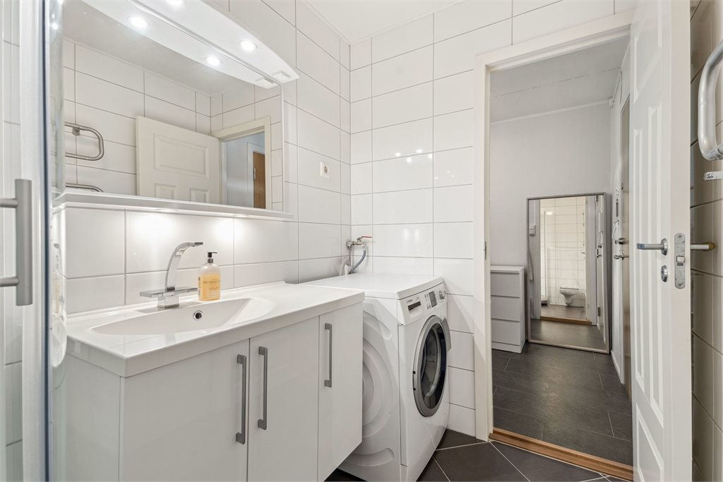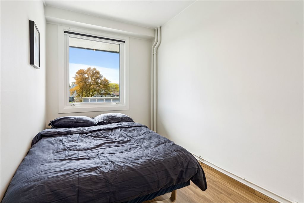 Velkommen inn – det første som møter deg er en liten entré med plass til sko og yttertøy. Her er det også plass til garderobeskap. Fra gangen er det adkomst til boligens to soverom og baderom. Leiligheten har to romslige soverom, begge med plass til seng, kommode og diverse møbler. Hovedsoverommet har et innebygd garderobeskap som gir ekstra oppbevaringsplass og frigjør rommet til andre møbler. Soverom 2 er ypperlig som barnerom, gjesterom eller kontor. Boligens baderom er flislagt. Det er utstyrt med dusjhjørne, toalett, servant, speil og opplegg for vaskemaskin.