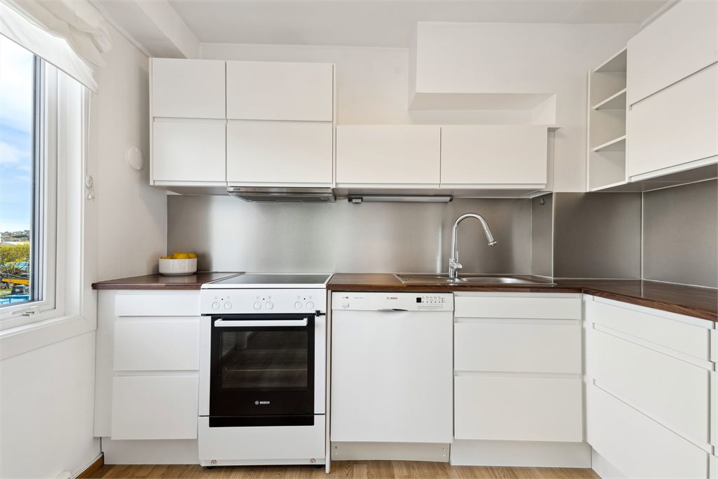 Kjøkkenet er innredet med slette hvite fronter, godt med arbeidsbenk og skapplass. (Kjøkken fra Sørlandskjøkken 2007, byttet fronter i 2021, info fra sist eier). Hvitevarer på kjøkken står igjen.