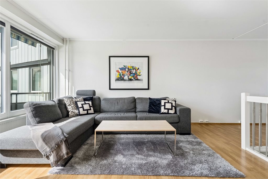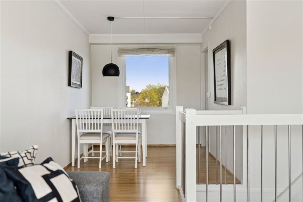 Når man kommer opp til 2. etasje av leiligheten, ankommer man boligens hjerte. Stuen har generøse vindusflater som gir rikelig med lysinnslipp og en nydelig utsikt over nærområdet. Dette skaper en lys og luftig atmosfære som er beundringsverdig. Stuen har flere møbleringsmuligheter, som gir