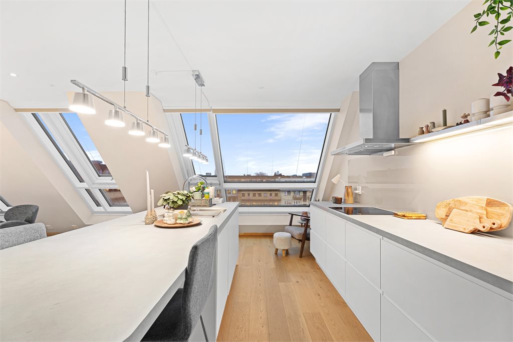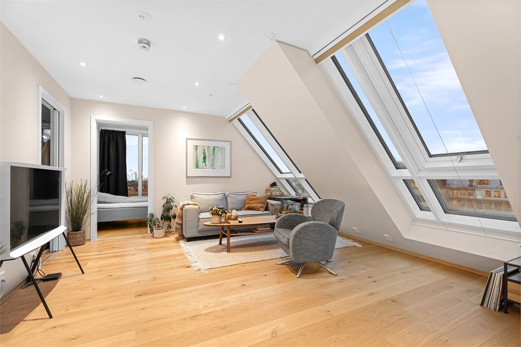 Hovedetasjen i 6. etasje byr på en lys og luftig stue med store vindusflater som slipper inn rikelig med dagslys og gir en fin utsikt over byen. Her er det god plass til både sofagruppe og spisebord. Kjøkkenet ligger i tilknytning til stuen og er utformet med en praktisk kjøkkenøy med spiseplass, dette er et naturlig samlingspunkt enten det er hverdagsfrokost eller hyggelige middager med venner.Videre finner du to soverom i hovedetasjen. Soverom 1 har store vindusflater og utgang til egen balkong, et perfekt sted å starte dagen med frisk luft og morgensol. Soverom 2 er romslig og har plass til både dobbeltseng og garderobeskap. Rommet har i tillegg direkte adkomst til badet, noe som gir en privat og komfortabel løsning. Badet er pent flislagt og utstyrt med dusjhjørne samt opplegg til vaskemaskin og tørketrommel. I tillegg finnes et separat WC med servant.