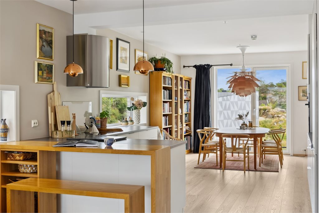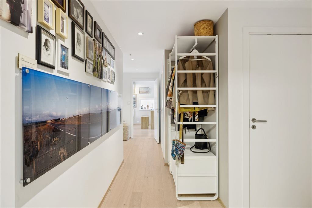 Leiligheten har en meget gjennomtenkt og funksjonell planløsning, med tydelig sonedeling mellom private og sosiale rom. Fra en romslig entré med god plass til garderobeløsning, har man adkomst til en praktisk innvendig bod samt ett av leilighetens to bad – ideelt for både gjester og hverdagsbruk.Boligens sosiale hjerte er den luftige stue- og kjøkkenløsningen, som strekker seg langs fasaden og gir gode lysforhold gjennom store vindusflater. Kjøkkenet er plassert naturlig mellom stue og spisestue, og legger til rette for både hverdagsmåltider og sosiale sammenkomster. Fra stuen er det utgang til en flott balkong med god plass til utemøbler og fin utsikt mot havet.