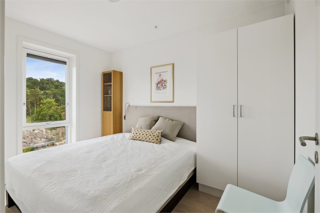 Leiligheten har tre soverom, hvorav hovedsoverommet ligger skjermet til med enkel adkomst til bad. De øvrige soverommene er romslige og fleksible i bruk – perfekt som barnerom, gjesterom eller hjemmekontor. Det andre badet er plassert sentralt i leiligheten og er tilknyttet vaskeromsløsning, noe som gir en praktisk og effektiv hverdag.