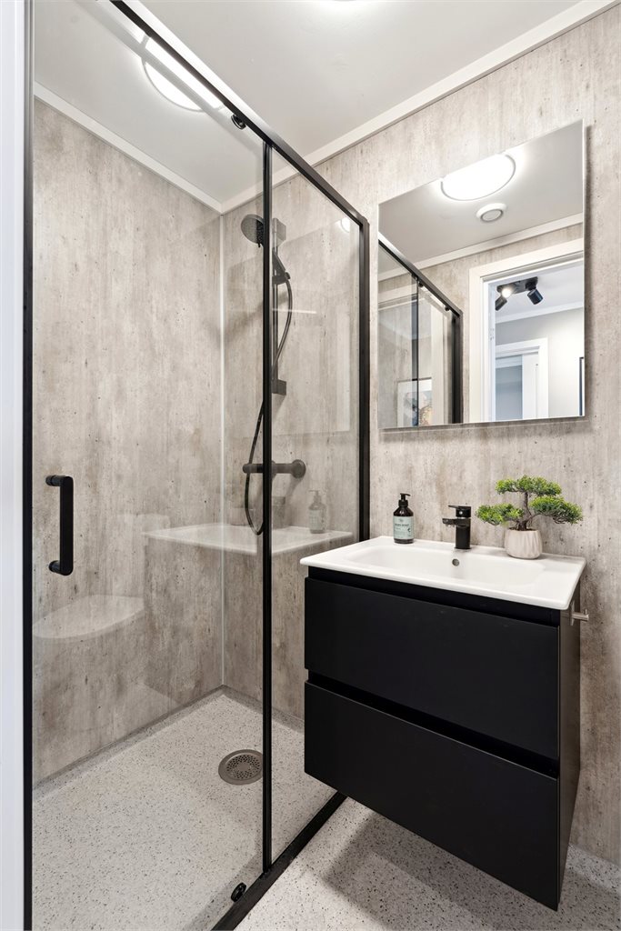 Stort moderne baderom med lyse vegger og pene fliser på gulv! Det er sorte detaljer og dusj! Her er det også opplegg til vaskemaskin.