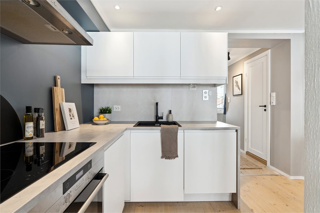 Kjøkkenet er innredet i en praktisk form med god med ska- og oppbevaringsplass. Integrerte hvitevarer medfølger handelen .