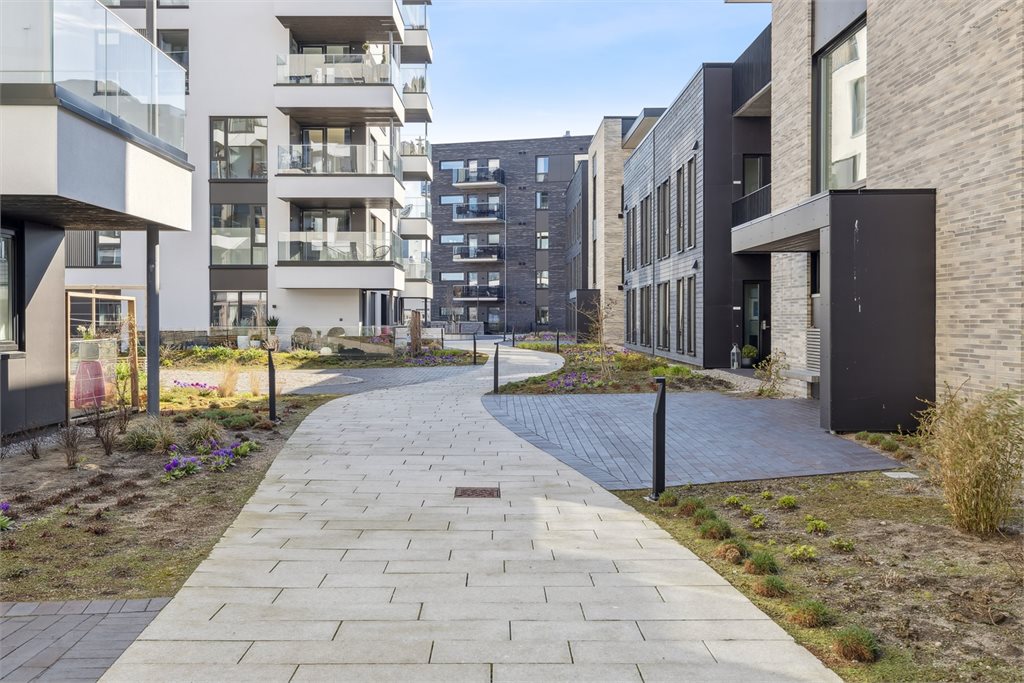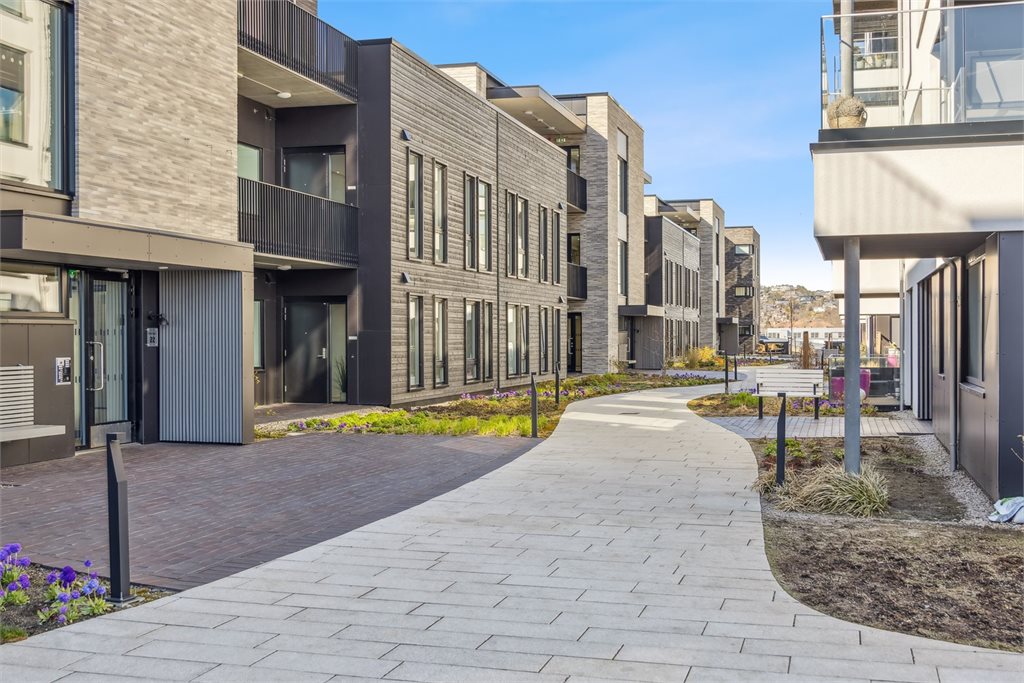 Felles eiet tomt for sameiet.Utomhusanlegget i 2. etasje inneholder en boliggate som leder fram til inngangene og binder sammen felles uterom. Beplantningen understreke karakteren på anlegget, og er romdannende for møteplasser, samlingsplasser og selve hagen med mindre intime arealer. Vegetasjon er sammensatt av klatreplanter, busker og stauder.