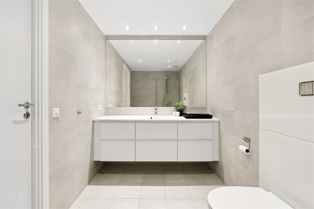 Leiligheten har to store flislagte baderom med lys fliser på vegger og gulv.