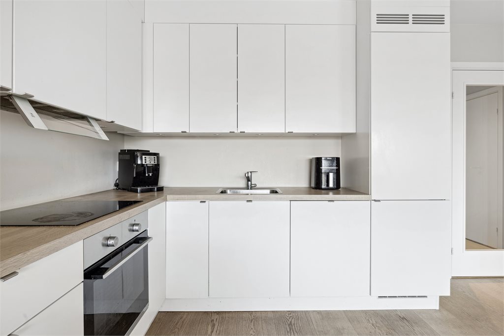 Kjøkkenet er innredet med praktisk form i åpning mot stuen, som gjør rommet sosialt ved besøk. Det er slette fronter, godt med arbeidsbenk og oppbevaring i skaper.