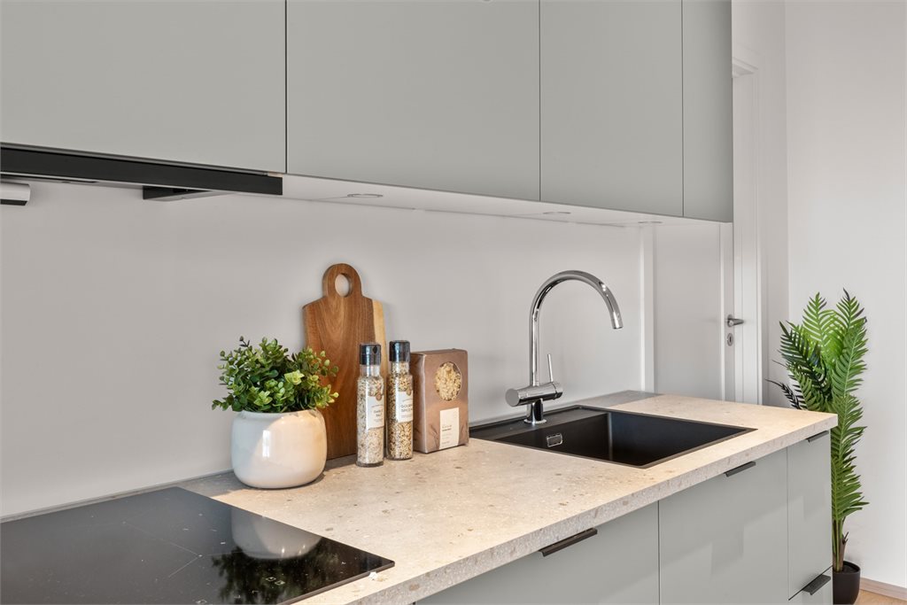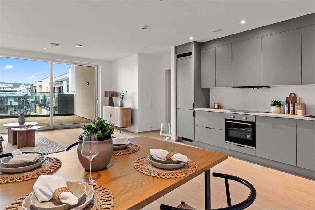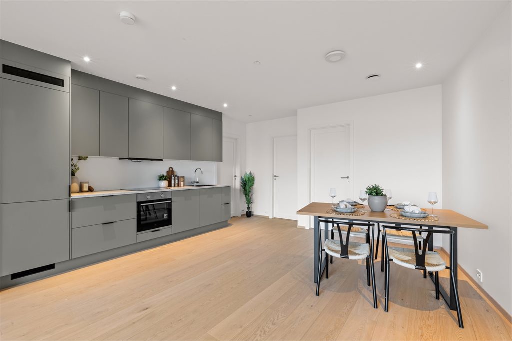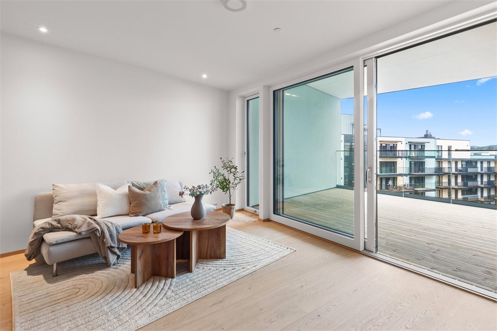 Stue og kjøkken er i en åpen og sosial løsning, med store vindusflater som gir godt lysinnslipp. Fra stuen er det utgang til en stor, solrik balkong – perfekt for å nyte late dager med grill, utemøbler og hyggelige sammenkomster.