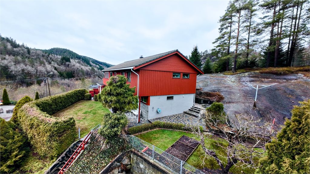Eiendommen har også garasjer og tilhørende rom som kan benyttes til hobby eller oppbevaring. Utendørs finner du en pent opparbeidet tomt med steinsetting, beplantning og flere soner for opphold. Dette er en bolig med god plass, praktiske løsninger og et solid utgangspunkt for videre utvikling.