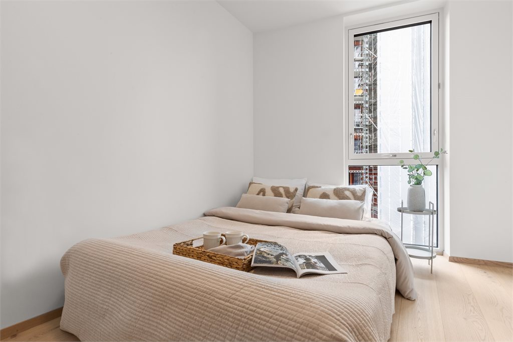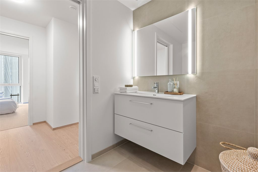 Leiligheten har tre gode soverom. Ett av soverommene har utgang til balkongen, mens hovedsoverommet har en praktisk mellomgang som leder til et ekstra, delikat og flislagt bad – perfekt som en privat sone.